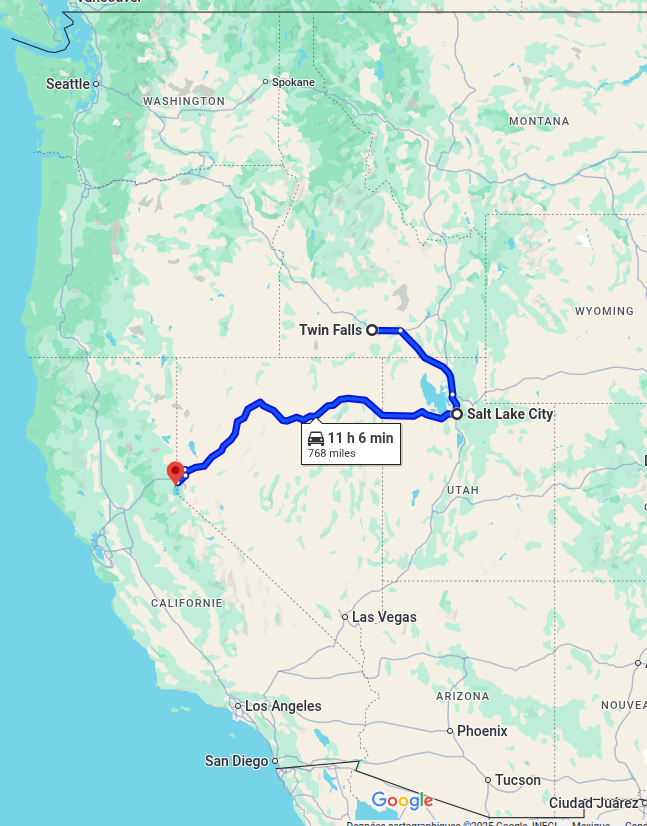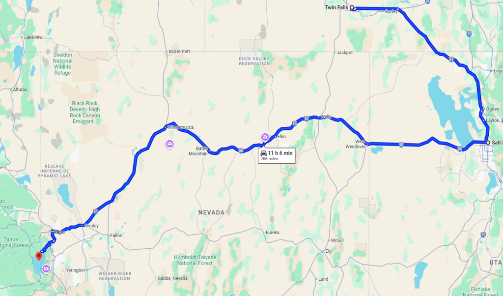 Après être revenus bosser en Idaho pour notre deuxième arrêt, on a décidé que notre prochaine destination serait le Lake Tahoe. Et pour y arriver… c’était pas du tout un petit trajet. Des heures et des heures de route : Twins Falls – Pocatello – Salt Lake – Reno -Truckee – Tahoe City.